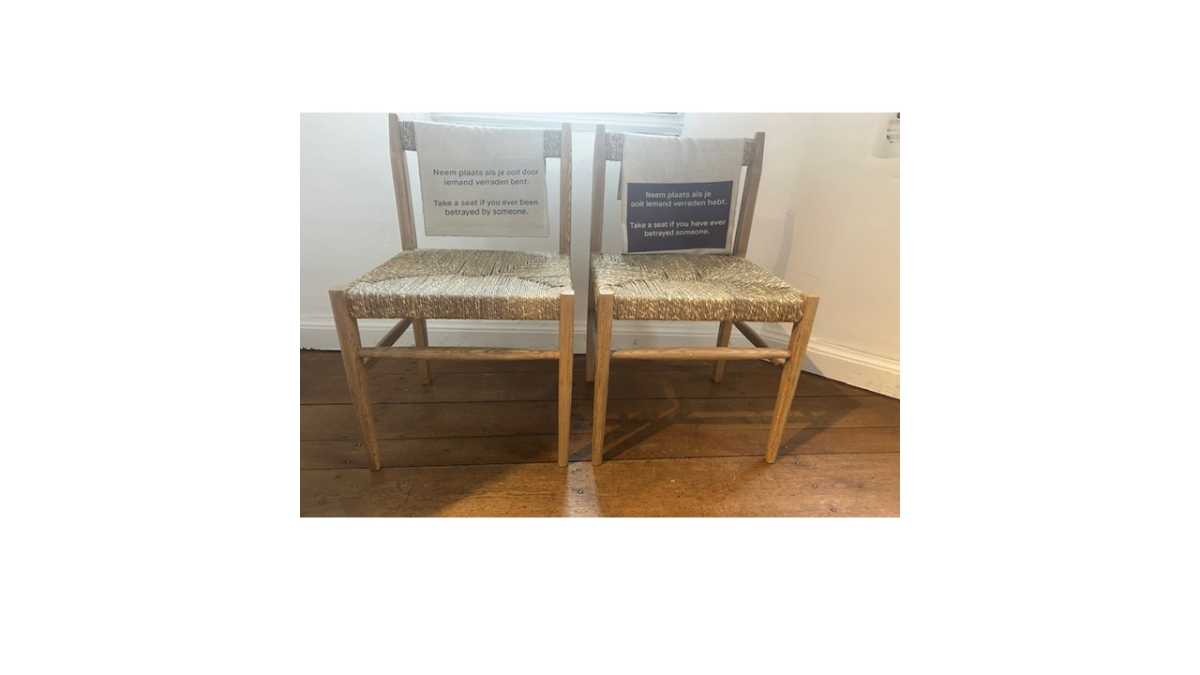 Met mijn museumjaarkaart kom ik in het hele land: vel deuren gaan open. Een favoriet museum is het Catherijne Convent in Utrecht. Daar is nu een expositie over (verschillende soorten) “liefde” Liefdesverdriet en verraad wordt ook meteen meegenomen. Twee stoelen zetten mij aan het denken: “Neem plaats als je ooit verraden bent. Neem plaats als je ooit iemand verraden hebt”. Op welke stoel wil u gaan zitten?
