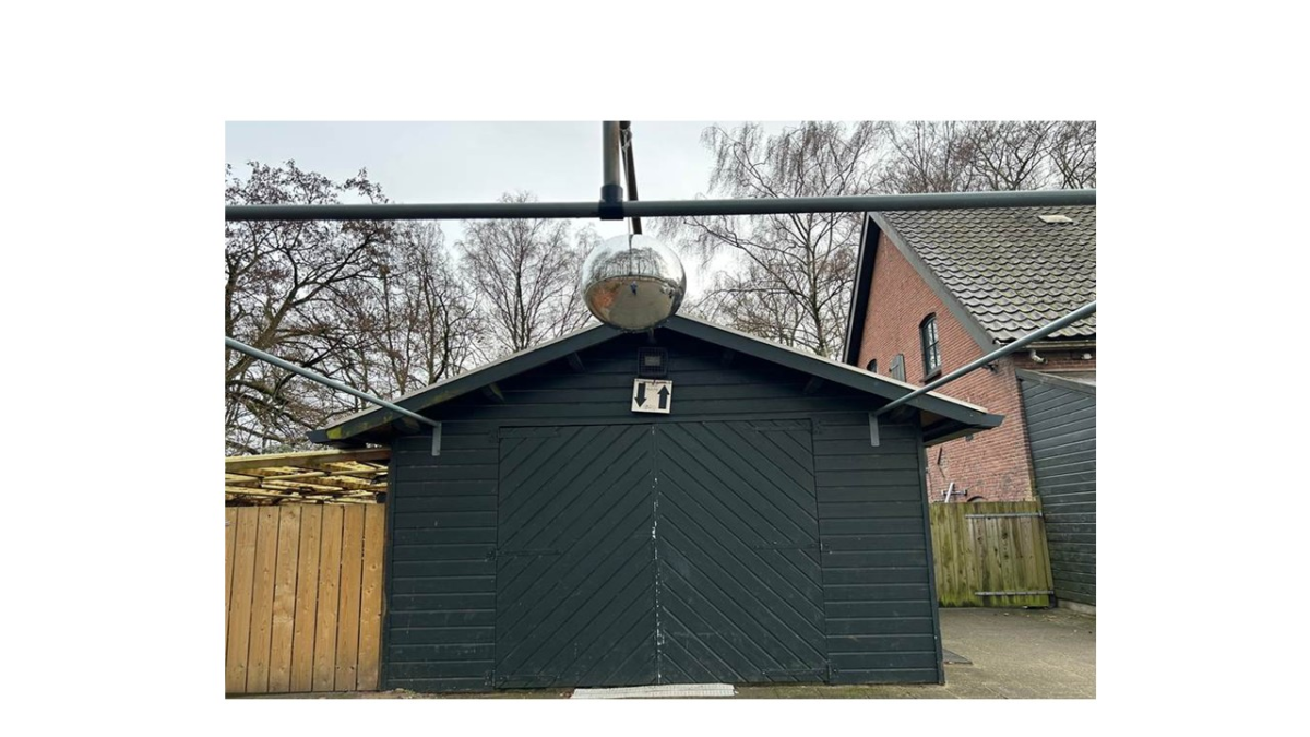 Wie mag vergaderen in de Vosheuvel ziet meteen de naaste omgeving. Daar bungelde nog een zilveren kerstbal. Als je goed kijkt is de fotograaf ook nog in beeld. Binnenkort wordt deze bal vast opgeruimd. Nu heeft de wind nog vrij spel: een balorige bal.