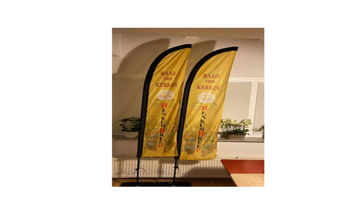 Het was een bijzonder samenzijn waarin we inderdaad samen God volop hebben geloofd. Na de zegen werd onze gemeente officieel welkom geheten als lid van de Raad van Kerken RenkumBreed. De banier die u ziet afgebeeld stond na de oecumenisch viering ook buiten te pronken. Bij elk gezamenlijke activiteit zult u deze nieuwe banier weer zien!