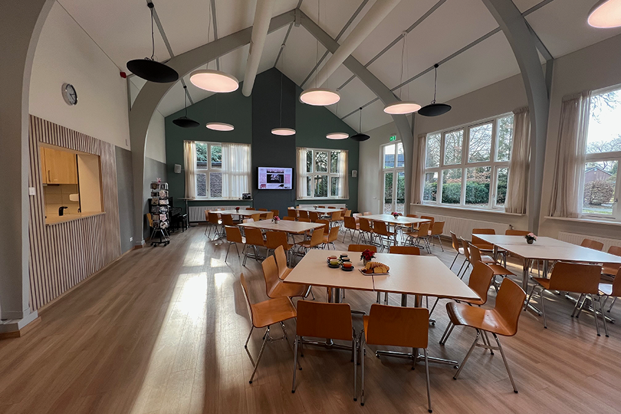 De Ontmoeting is de grootste zaal in het kerkgebouw. De zaal heeft een capaciteit van 50 mensen en kan worden vergroot naar een zaal voor 80 mensen door de tussenwand open te schuiven. Meer foto's >